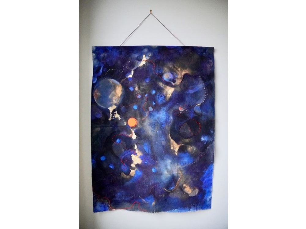 The piece is roughly shaped like a mitochondrial DNA, and layers of paint, gold leaf and thread are woven into the canvas to stunning effect, reflecting the complexities of the diagnostic journey so many patients have endured.