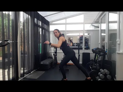 This exercise warms up the gluteal muscles and muscles in the legs whilst providing a dynamic stretch on the calf muscles. Standing on one leg with a bend in the knee (small single leg squat position), tap the toe of the other foot out in front of you, and keep tapping it round in a semicircle. When your foot is approaching being behind you, start to push the heel of that foot down towards the ground. This is the part that provides the stretch at the back of the lower leg.